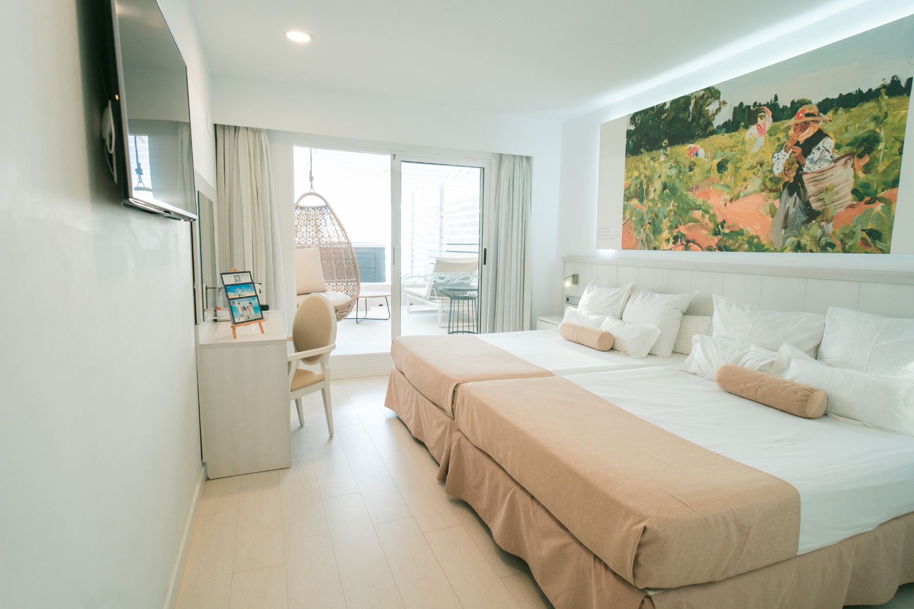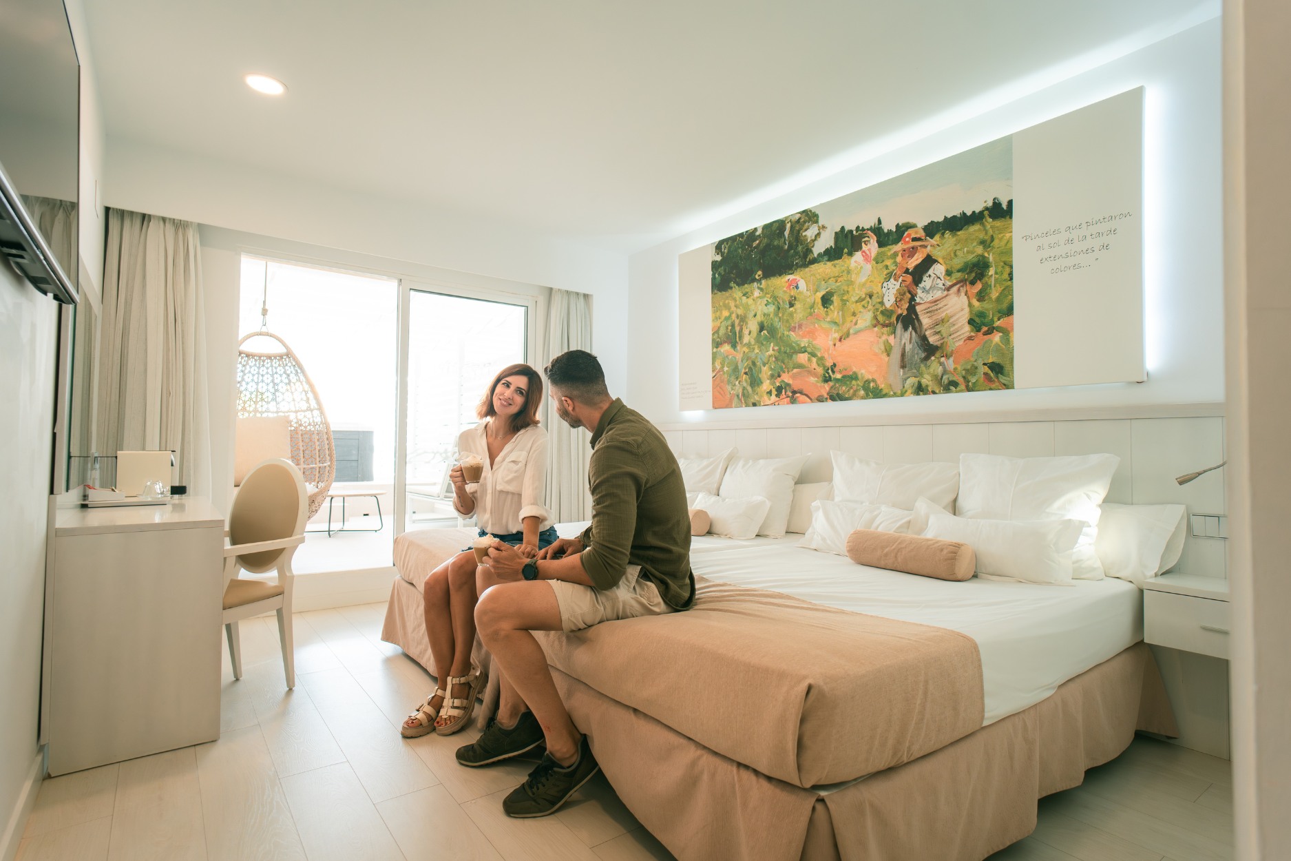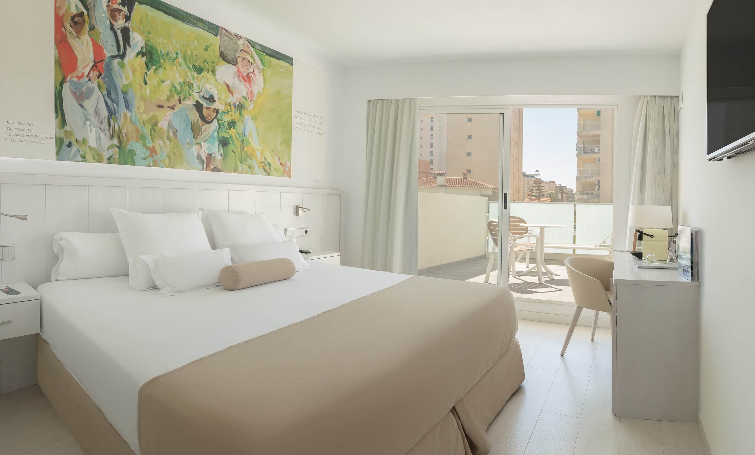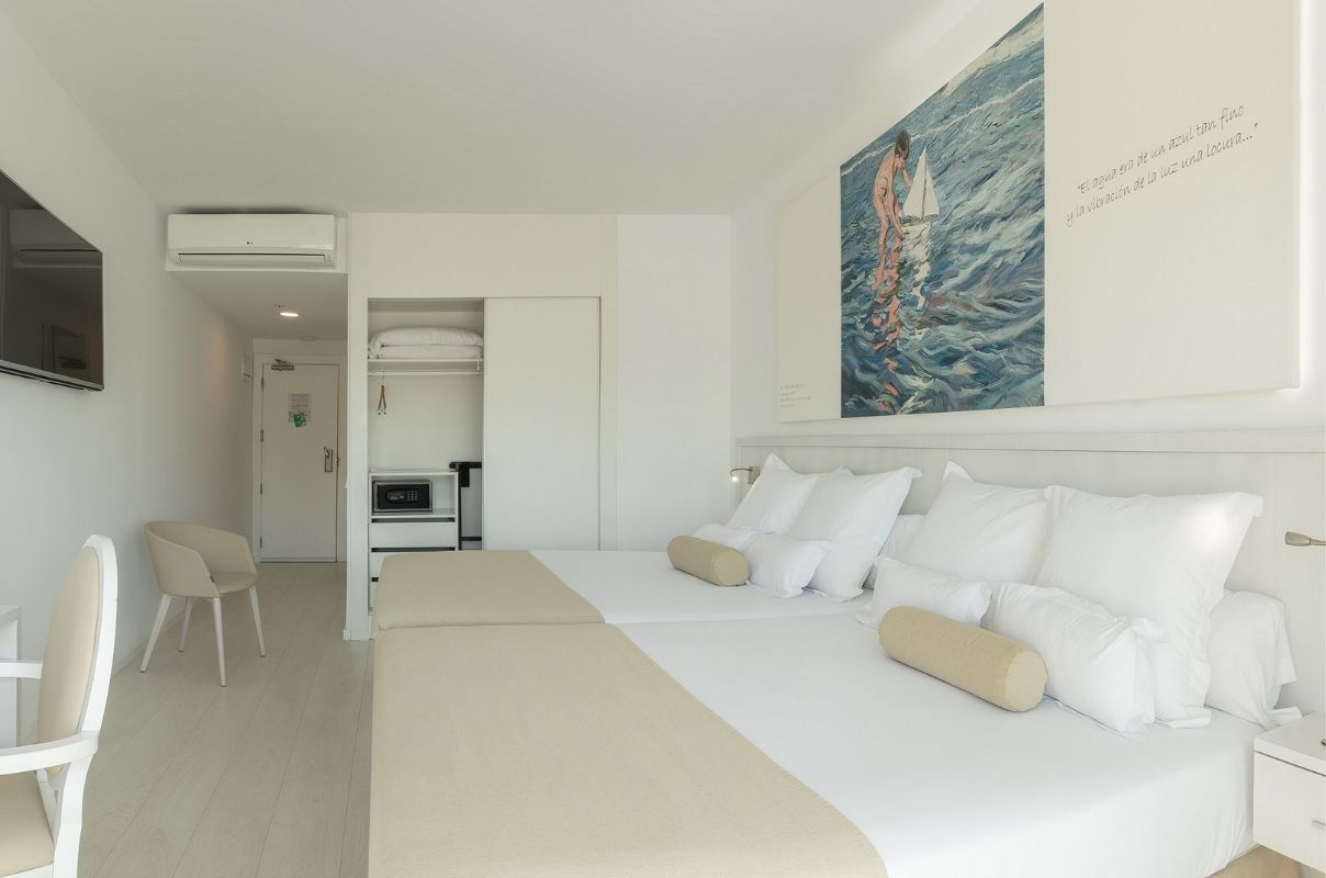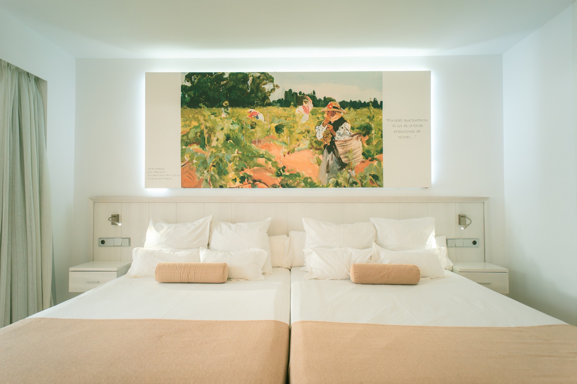The Mediterranean spirit that accompanied Joaquín Sorolla throughout his life is present in every one of our rooms. Spaces designed for rest, where comfort meets a serene, elegant and contemporary atmosphere inspired by the light and colours of the Valencian painter’s work.